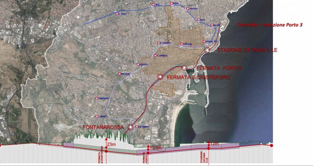 La soluzione Porto 2, di cui vi avevamo dato notizia in questo articolo, prevedeva un percorso sino ad Acquicella interrato, con la realizzazione di un tunnel con le nuove fermate di Porto e Ursino e il seminterramento di Acquicella.