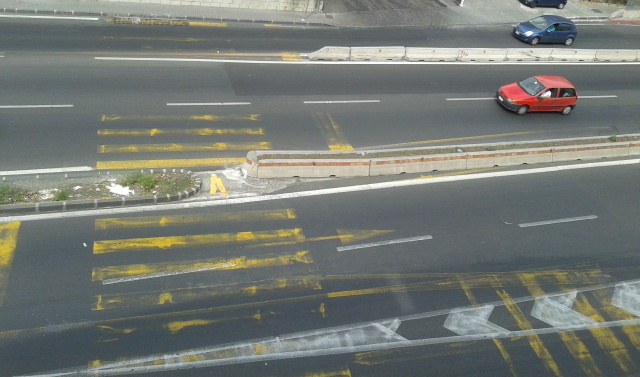 È attualmente ancora presente la segnaletica, ormai malridotta, dei lavori in corso per la costruzione del sottopassaggio! Essa consentiva, in particolare, l’attraversamento pedonale in relazione alle caratteristiche del cantiere che vi sorgeva nel lontano 2009. Adesso questa segnaletica suggerisce l’attraversamento in un punto pericolosissimo: all’uscita del sottopassaggio, alla fine di un dosso stradale sulla carreggiata in direzione Misterbianco, durante un tratto in discesa ed all’inizio dell’immissione in Viale Fleming, sulla carreggiata in direzione Ognina.