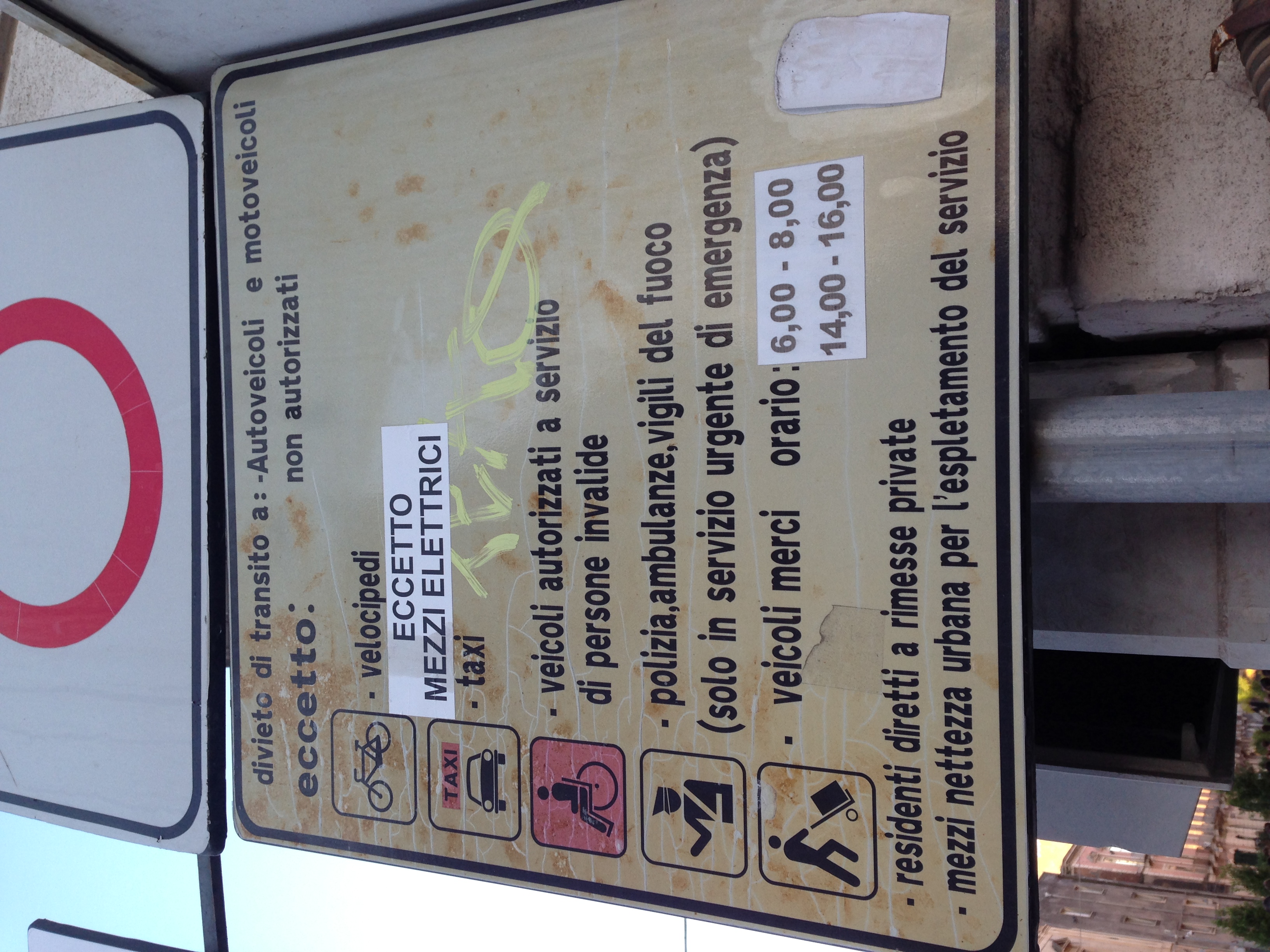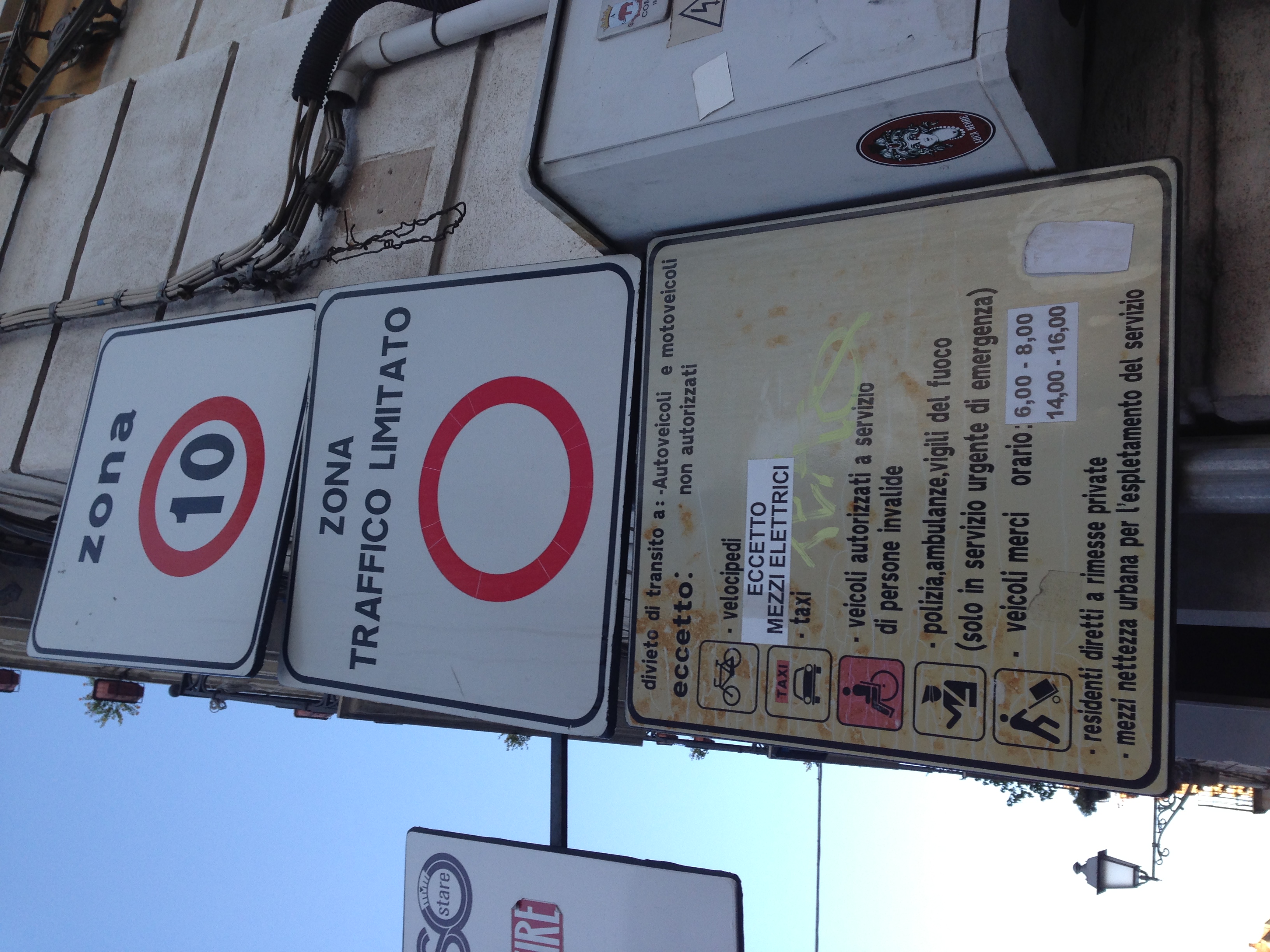 – biciclette, taxi,  veicoli autorizzati a servizio di persone invalide, polizia, ambulanze, vigili del fuoco (solo in servizio urgente di emergenza), veicoli merci nelle fasce orarie 6:00/8:00 e 14:00/16:00, residenti diretti a rimesse private, mezzi nettezza urbana per l’espletamento del servizio.